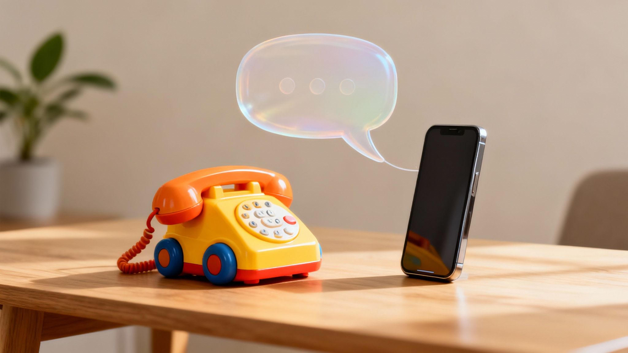 A toy telephone and a modern smartphone on a wooden table connected by a glowing chat bubble.