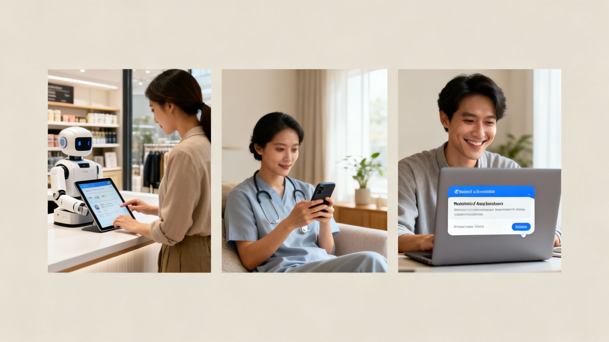 Three diverse individuals interacting with conversational AI across retail, healthcare, and personal use.